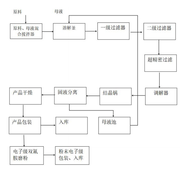 將母液或軟化水打入投料攪拌器,按照比例投入雙氰胺,經(jīng)泵打入溶解釜,升溫充分溶解后,放入溶解液儲(chǔ)罐后經(jīng)泵打入一級(jí)過濾器,過濾液進(jìn)入一級(jí)濾液儲(chǔ)罐,再經(jīng)泵打入二級(jí)過濾器,進(jìn)行精密過濾,濾液經(jīng)精密過濾器出口再經(jīng)超精密過濾器打入結(jié)晶鍋中結(jié)晶,冷卻結(jié)晶后由結(jié)晶鍋放出,經(jīng)離心機(jī)進(jìn)行固液分離,分離后的濕結(jié)晶體經(jīng)螺旋機(jī)送入燥機(jī)干燥,干燥后的成品,稱量、包裝。